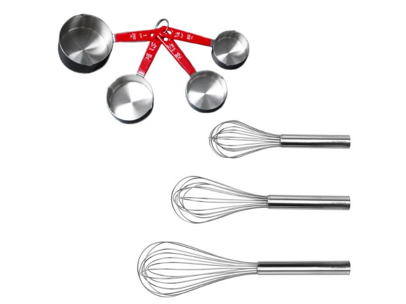 Set Includes: 3 Pieces tool set – 8″ whisk, 10″ whisk and 12″ whisk, 4 Pieces measuring cup set – 1/4 cup (60ml), 1/3 cup(80ml), 1/2 cup(125ml), 1 cup(250ml).The tool set hardware is constructed from 7 wire stainless steel so, whisk your eggs, whip cream, pancake batter and more. The complete baking tools you’ll need.