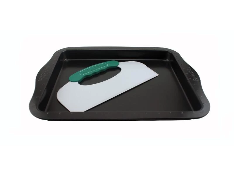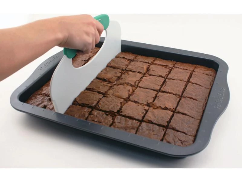 Cookie Sheet w/tool is more than quality baking pans; It’s also a convenient cutting system. The unique patented guideline grid around the outer edges of every pan allows you to simply line up an exclusive Perfect Slice cutting tool, and press down to create any portion size desired. Every slice is beautifully uniform. The cutting tool with silicone handle is tough enough to cut the cake yet won’t damage your pan.