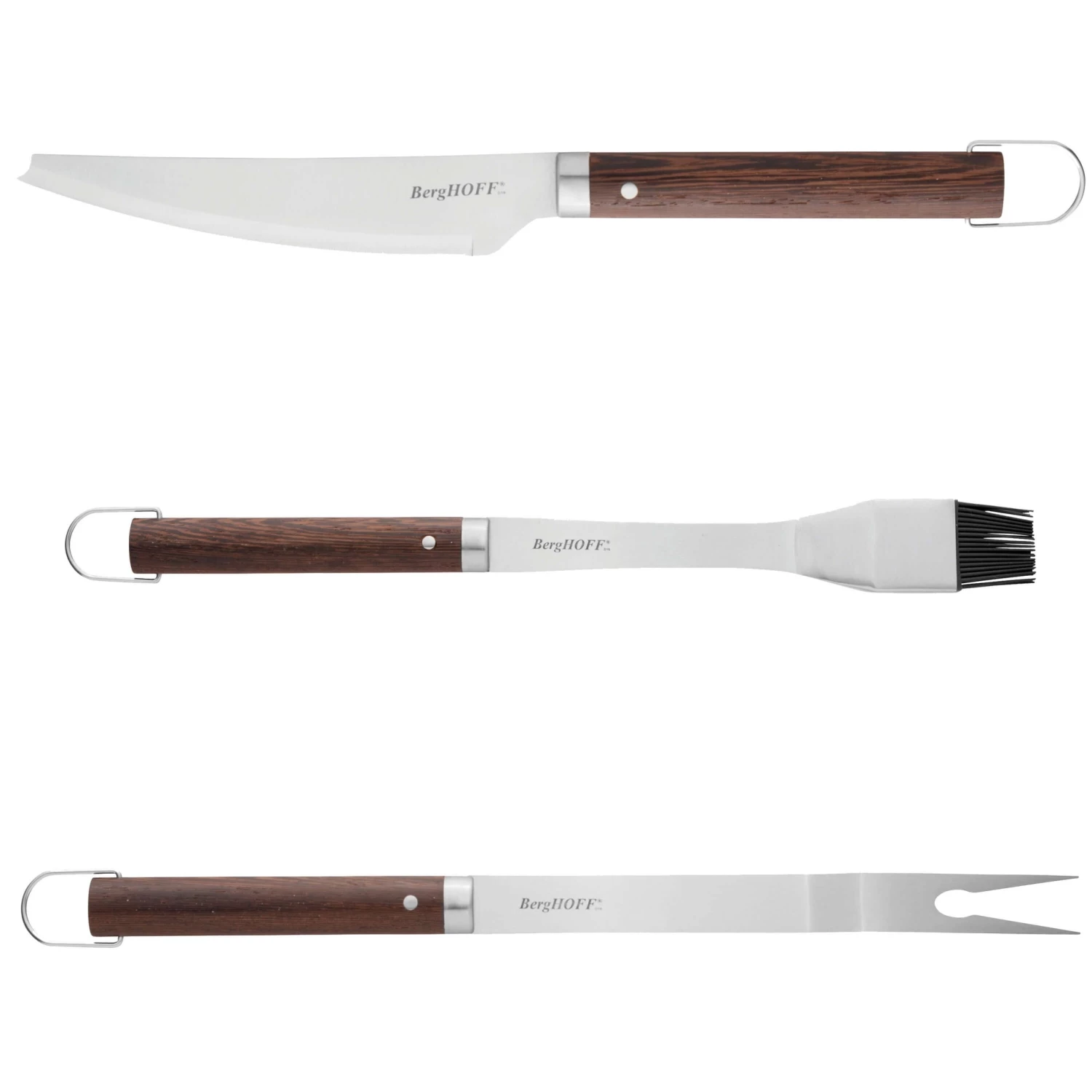 Get things smoking with this convenient 3-piece BBQ Set for all your grilling needs! This handy set comes with key grilling utensils that are a must if you’re going to perfect those wings, burgers, hot dogs, and skewers on the grill! Made with high quality stainless steel, sure to last for years to come! Comes with a BBQ 16.5″ Brush, a 14.75″ Knife, and a 17″ Carving Fork.
