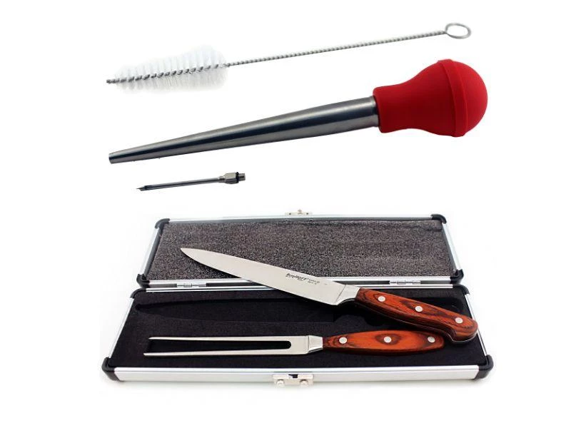 Pakka’s 3pc Carving set has triple-riveted wood handle ensures superior balance and comfort. The carving-style blade makes cutting meat and poultry effortless. Forged of high-carbon stainless steel. This quality baster by BergHOFF was crafted from surgical-grade stainless steel for long-lasting use. The all-in-one set comes with a cleaning brush for those hard to reach spots and a bulb that removes easily, making clean up a breeze. Use the stainless needle for tenderizing and adding flavor to meats and poultry or the bulb applicator for maintaining moisture in your meals. Ideal for roasting, barbequing, or smoking cooking methods. Set includes: 6″ carving fork and 8″ carving knife, plus a 14″ x 4″ aluminum storage case, 1x baster, 1x baster cleaning brush, 1x injector