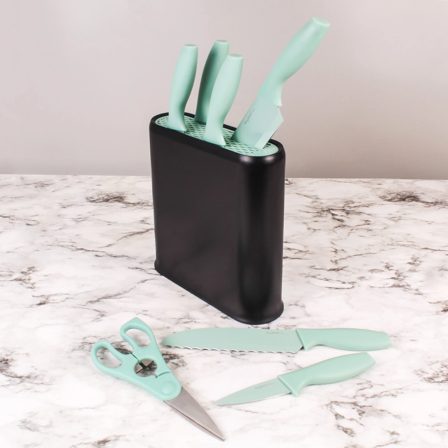 - Material: Made from high-quality, rust-resistant Stainless steel to keep its blades spotless and performing at their best. Non-stick blade with ergonomically designed handle, and PP Fitted protective sleeve. This set comes with a rubber universal knife block with two-tones knife insert attached.