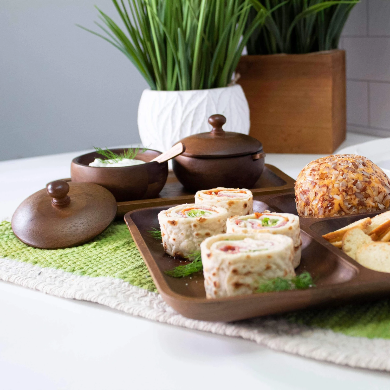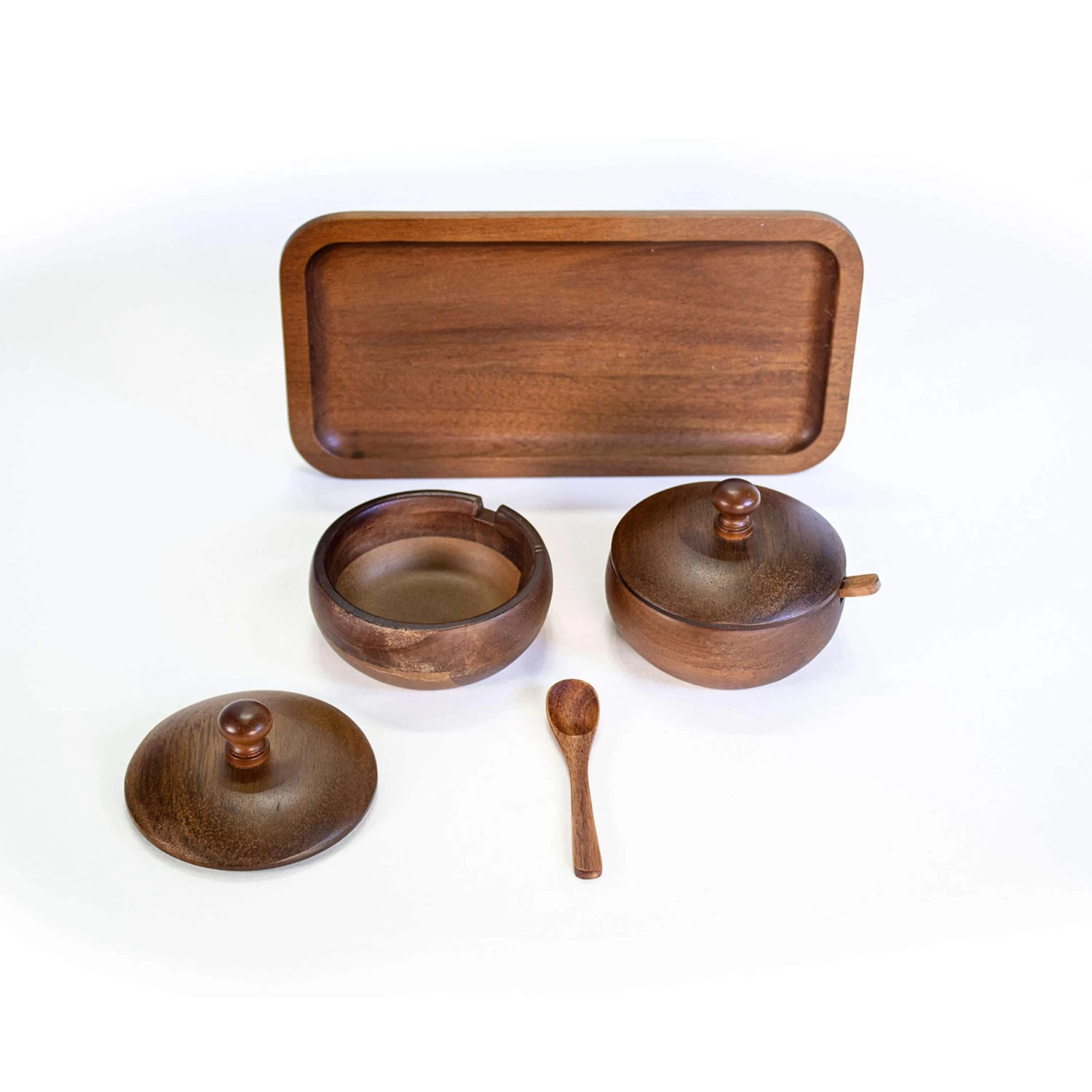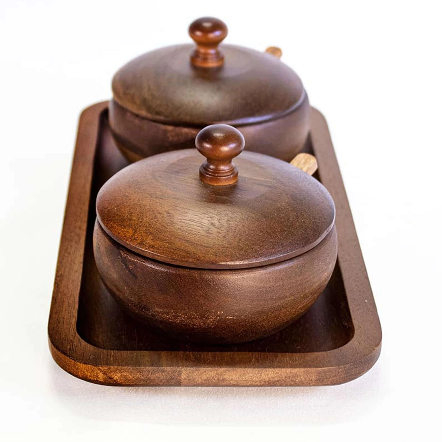 Let your seasonings be an on elegant display, filling your home with a fresh herb smell that will make you (and your guests) feel right at home. This Spice Jar Set is made of acacia wood, with a beautiful deep wood grain that is designed for durability. Fill each jar with your favorite seasonings – such as salt, pepper, cumin, herbs, or even sugar – and serve it on our high quality tray to complete the look. Handwash only.