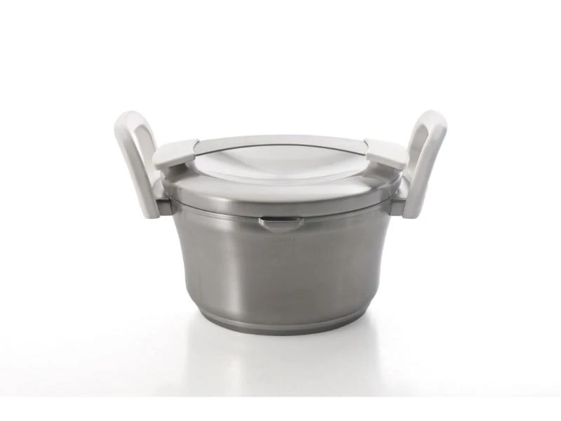 The 1.9qt patented 6-layer base covered casserole pot transfers heat quickly and spreads evenly throughout the complete surface of the base. 18/10 stainless steel body with white stay cool handles. Practical scaling inside. Convenient pouring rim and the design of the handles on body and lid offer hassle-free pouring of liquids. Suitable for all heat sources, induction included.