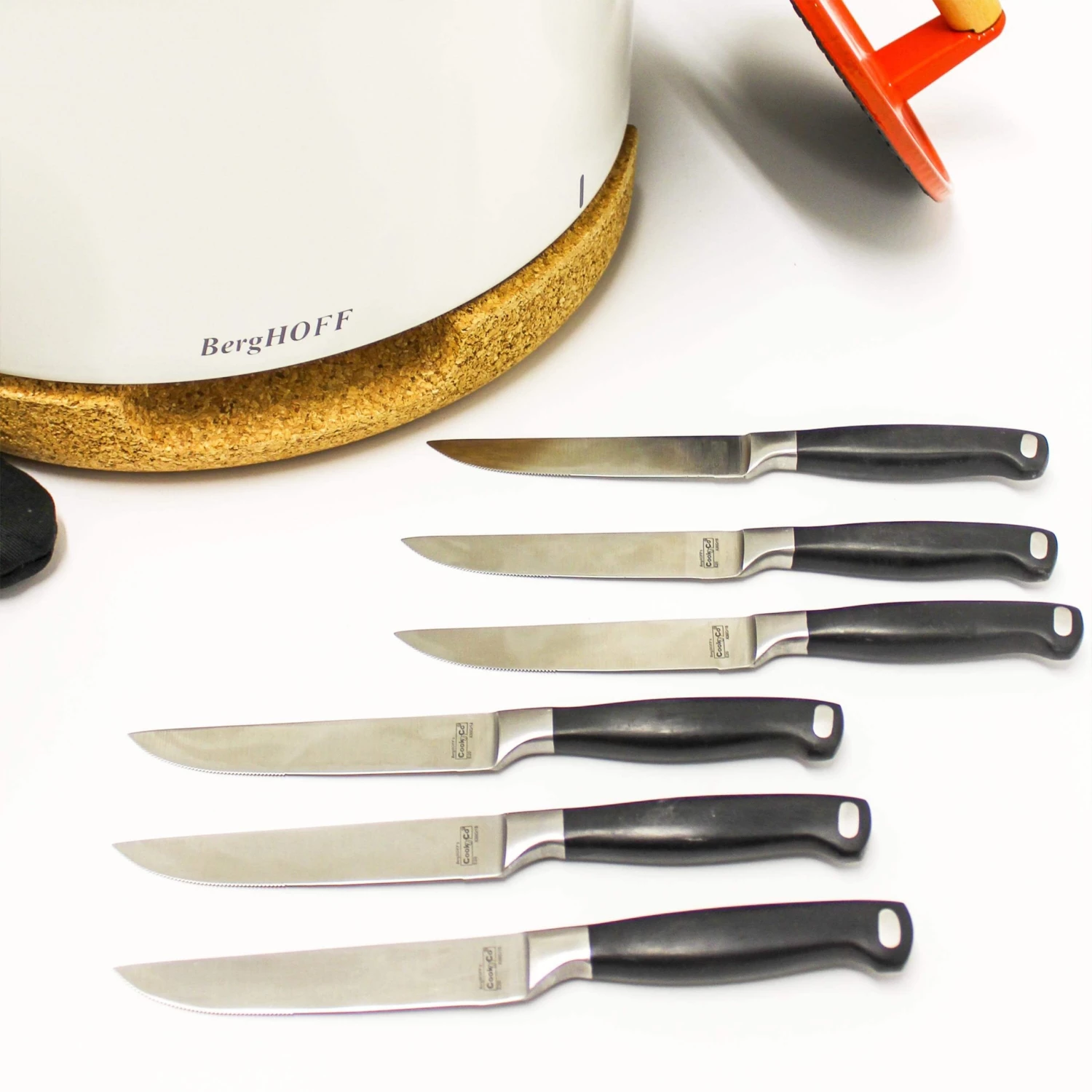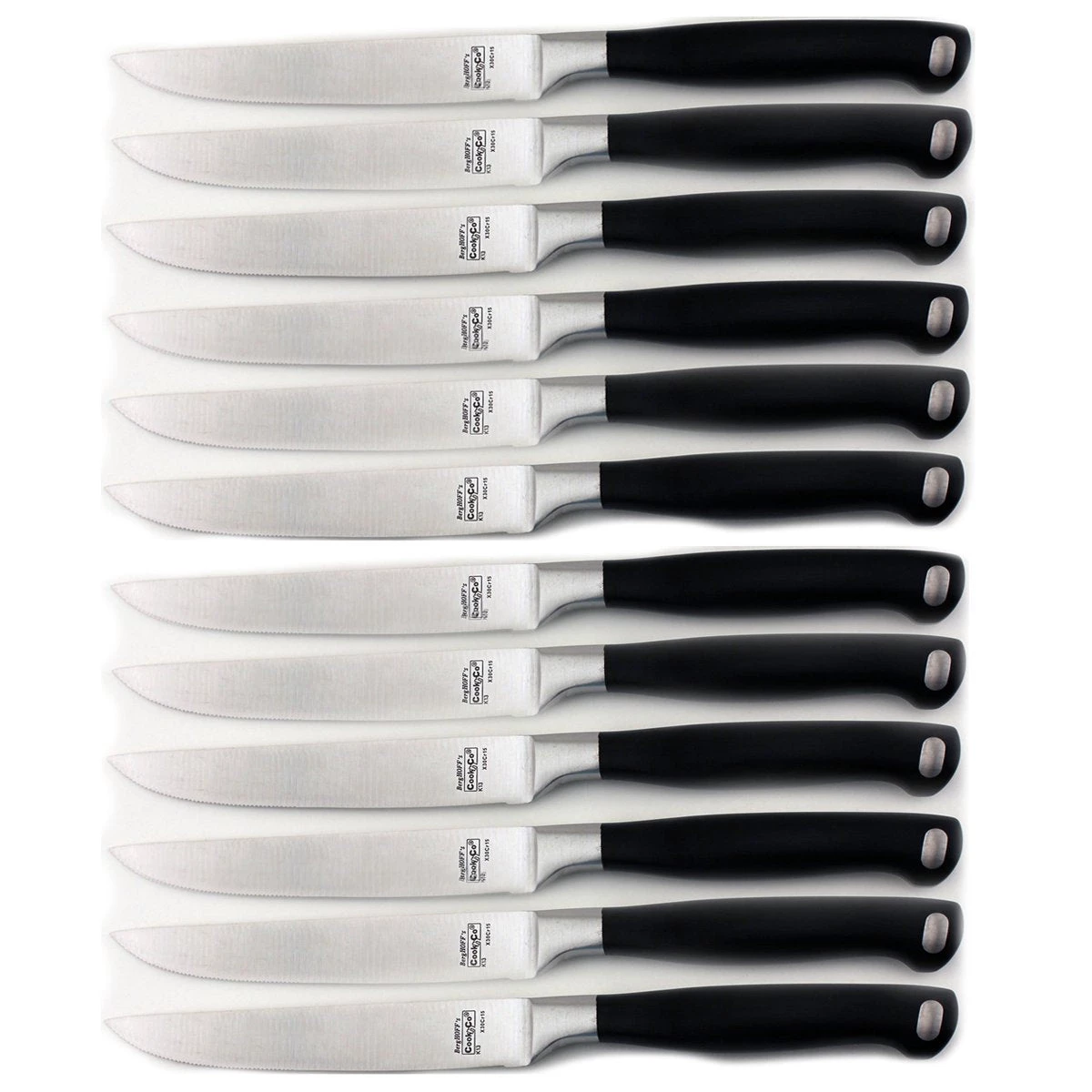 Set Includes: 12 Pieces Steak Knives. This knife set is made of durable high-quality stainless steel is absolutely indestructible and corrosion resistant. The highly polished surface is hard wearing, thick, easy to clean and hygienic. Advanced manufacturing methods plus traditional craftsmanship guarantee flawless product quality.