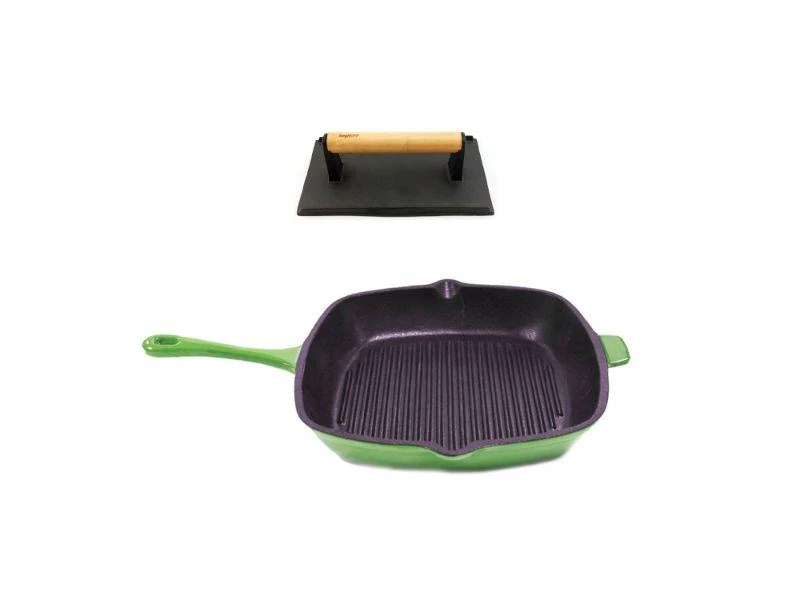 Set includes: 11″ Green Cast Iron grill pan, Green Cast Iron bacon/steak press. Heavy duty cast iron with hammered finish. Cast iron is known for it’s durable functionality, this bacon press cooks both sides evenly, leaving little room for shrinking. Also great for steaks and paninis! Cast iron has great heat retaining abilities and can be used on any heat source. Classic in a modern design, solid material for all your cooking needs! Oven safe up to 400°F.