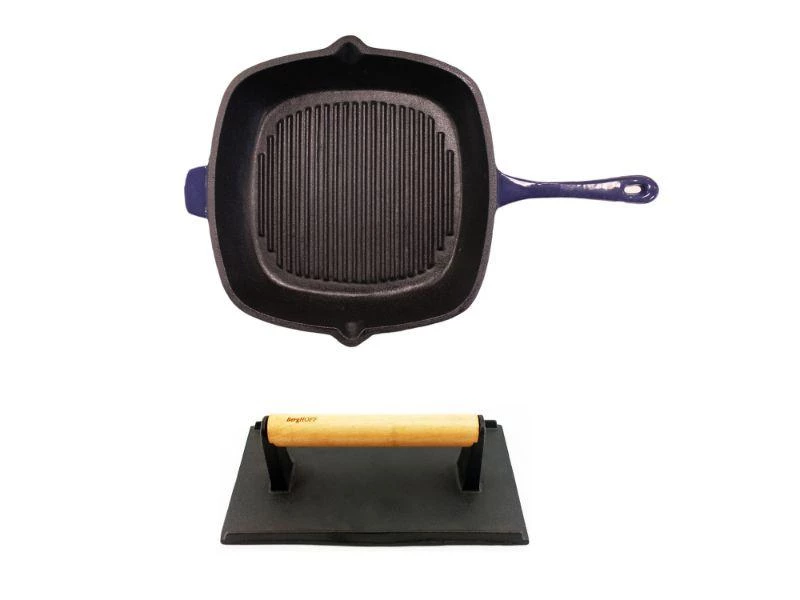 Set includes: 11″ Purple Cast Iron grill pan, Purple Cast Iron bacon/steak press. Heavy duty cast iron with hammered finish. Cast iron is known for it’s durable functionality, this bacon press cooks both sides evenly, leaving little room for shrinking. Also great for steaks and paninis! Cast iron has great heat retaining abilities and can be used on any heat source. Classic in a modern design, solid material for all your cooking needs! Oven safe up to 400°F.