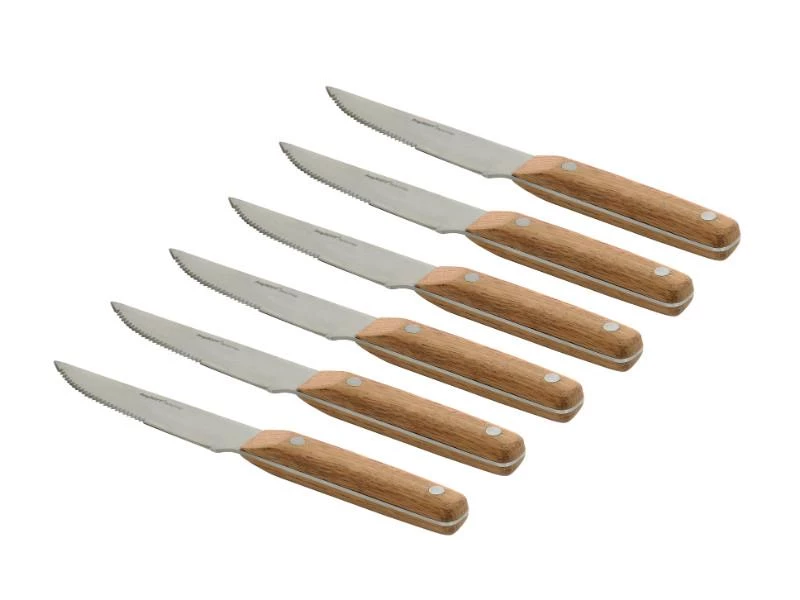 Steak knife, Set of 6. While the other knives are used in the kitchen to prepare the ingredients, these steak knives are meant to be used at the table when steak or other meats are served. They are a must-have for mealtime. Durable stainless steel blades ensure precision and accuracy. Combine them with the assorted steak forks.