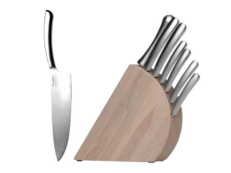 Versatile set with a knife for each cooking task. The modern look is sure to add a designer touch to any kitchen décor. This set includes 4.75″ utility knife, 6″ utility knife, 6″ boning knife, 9″ chef’s knife, 9″bread knife, 9″ sharpening steel, 1 wooden block.