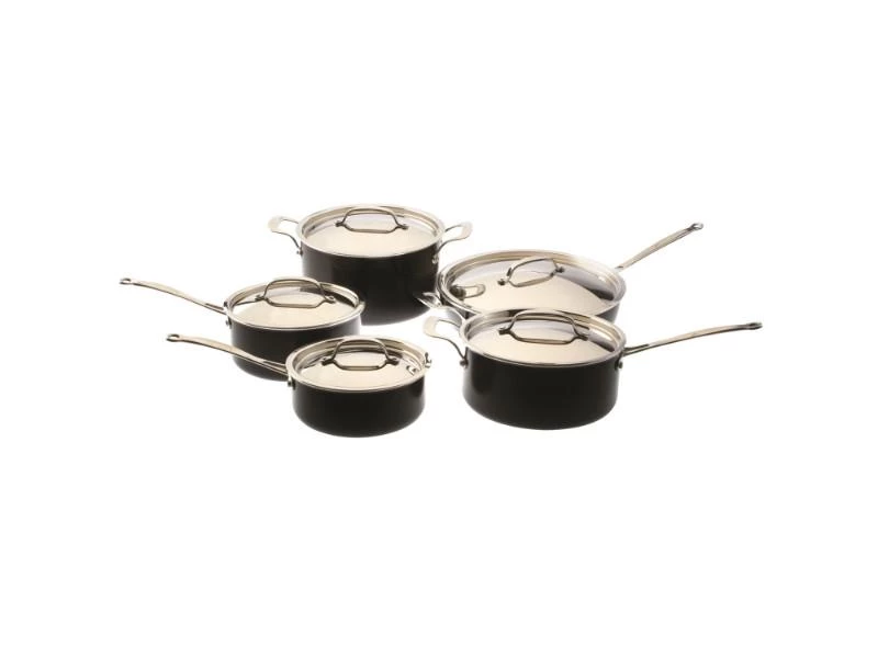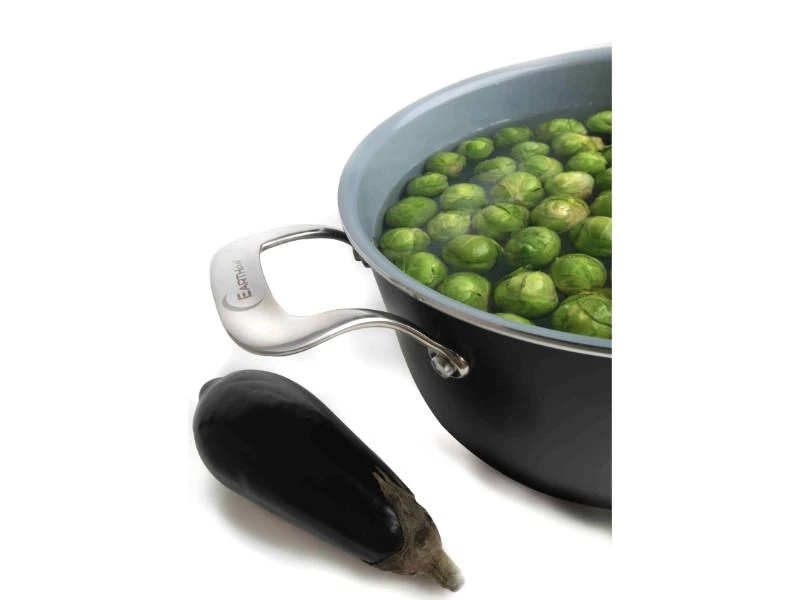 EarthChef Acadian 10 Pieces Cookware set is made of cast aluminum for fast and even heat distribution. Features riveted, cast stainless steel handles that stay cool while cooking for added safety. Ceramic non-stick coating that is naturally 6x stronger than traditional non-stick coatings. Has a practical pouring rim making draining and pouring off liquids easy. Polished stainless steel lid. Oven safe. Suitable for all heat sources. Includes: 9.5″/6.7 Qt covered casserole, 8.75″/4.2 Qt covered saucepan with helper, 8″/3.1 Qt covered saucepan, 7″/2.1 Qt covered saucepan, and 10.25″ covered deep skillet.