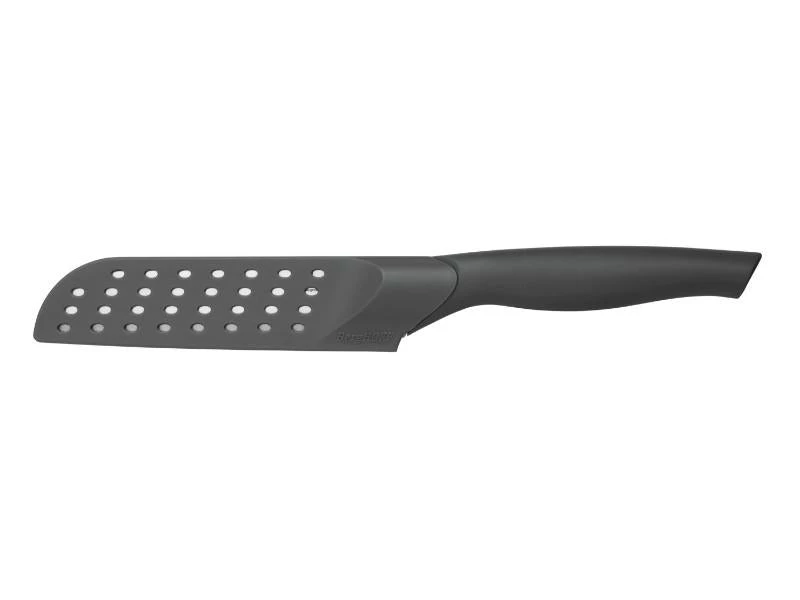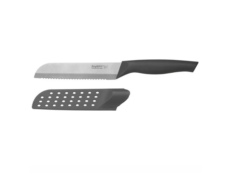 A crispy baguette, a crusty loaf of bread or a tasty hamburger bun, you’ll easily slice it with this razor-sharp bread knife. The serrated stainless steel blade smoothly pierces the crust and leaves the softer crumb intact. The soft-grip handle makes the knife a joy to use while the satin finish on the blade adds that extra stylish touch. When you’re done, just use the protective sleeve to conveniently store the knife and protect your hands as well as the blade.