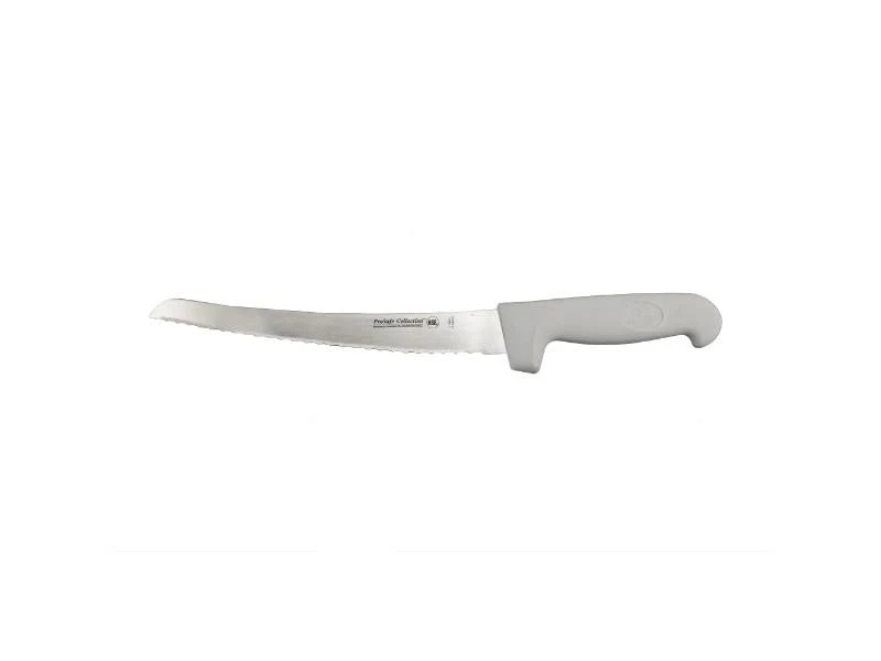 9″ Serrated Bread knife is made from high quality, ice hardened stainless steel, these knives feature a white polypropylene handle with a checkered pattern. Easily sharpened and holds their edge well. The handle is safe, high impact, slip resistant as well as antimicrobial and micro-organism safe. The knife is and low temperature resistant and safe to use in the freezer.