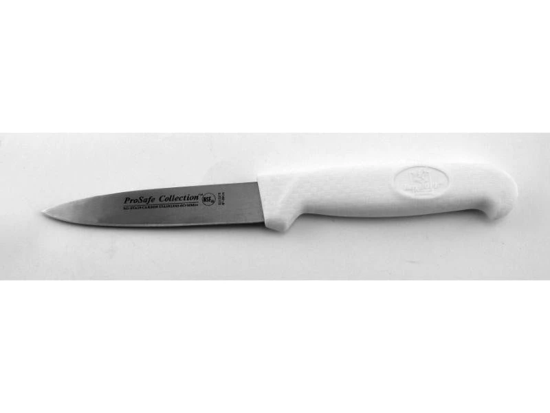 The 4″ Utility Knife is made from high quality, ice hardened stainless steel, these knives feature a white polypropylene handle with a checkered pattern. Easily sharpened and holds their edge well. The handle is safe, high impact, slip resistant as well as antimicrobial and micro-organism safe. The knife is and low temperature resistant and safe to use in the freezer.