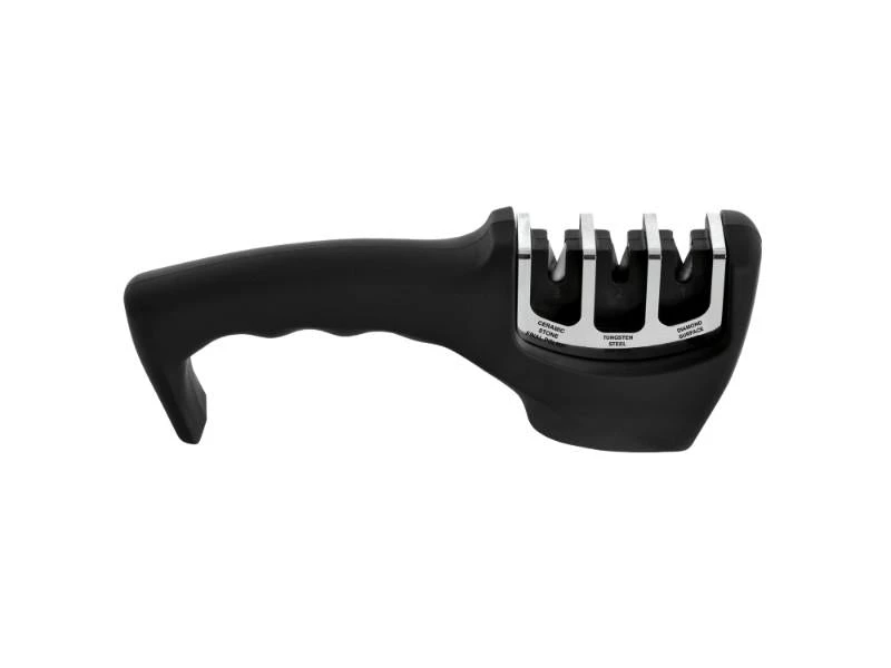 Dull knives are a thing of the past! With this handy pull-through sharpener you can sharpen your kitchen knives in 3 simple stages. The diamond surface prepares the knife for sharpening, the tungsten steel restores the cutting edge into a V-shape and the ceramic stone polishes the blade and removes any irregularities. The sharpener’s comfort-grip handle with non-slip base ensures extra stability.