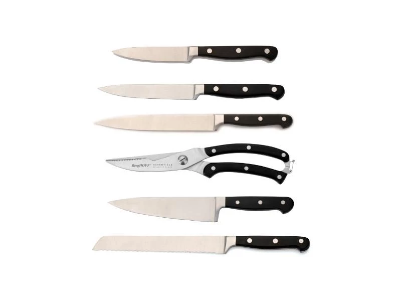 This set includes 14″ shears, 3.5″ peeling knife, 8″ bread knife, 8″ carving knife, 8″ chef’s knife – High quality stainless steel blade. Each knife is precision forged from one piece of no-stain high carbon steel. Each knife is crafted specifically for its own duty. Ergonomic handles allow for safe and secure handling.