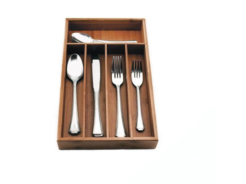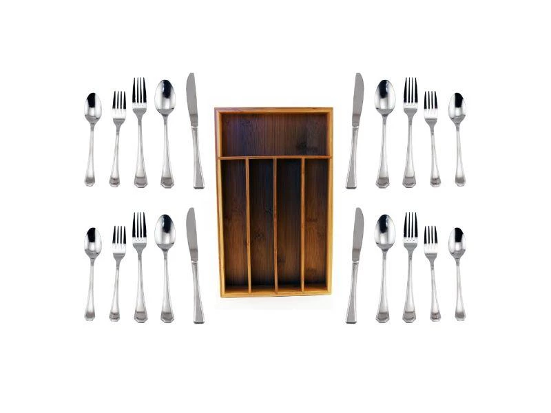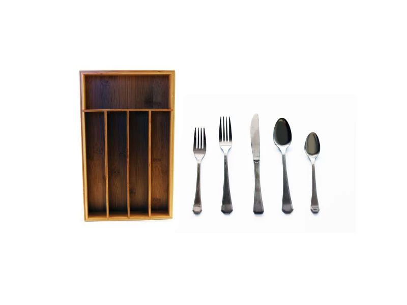 Set Includes: Cook N’ Go 5-slot flatware organizer and Everyday 20pc Flatware Set. This flatware set features a classic design that looks great in any setting. It’s a great choice for everyday meals at home. All the right spaces for flatware in renewable bamboo. Designed to fit almost any kitchen drawer. Eco-friendly, and functional!