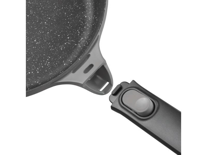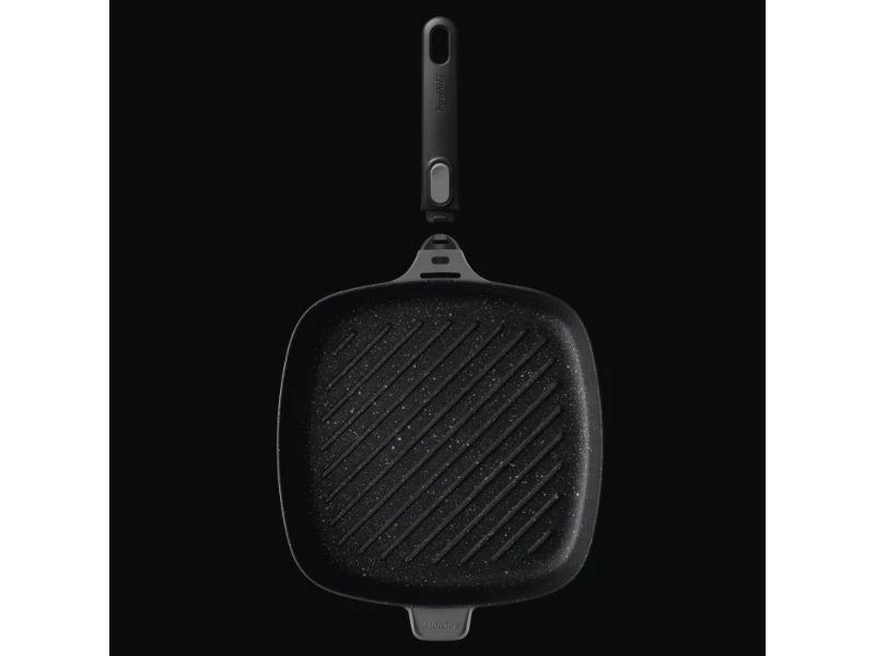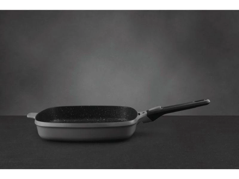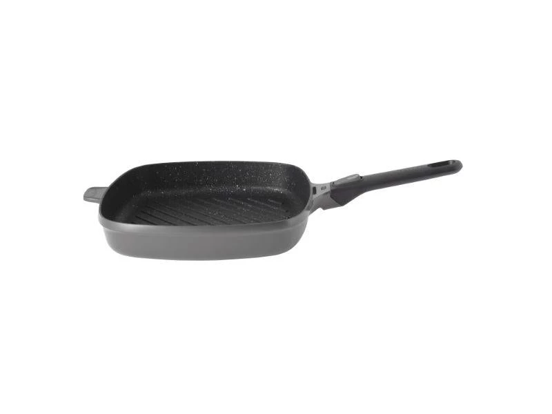 A batch of perfectly seared burgers, salmon fillets or vegetables, it’s a piece of cake when you’ve got this 28 cm grill pan at your side. The aluminum body ensures a fast and even heat distribution on any kind of stovetop while the ridged base gives your ingredients those typical sear marks and allows moisture and fat to escape for an extra crispy result. No need to worry about the clean-up thanks to the multilayered non-stick coating that guarantees an easy food release. An added bonus is the detachable handle that allows you to use the pan in the oven and save valuable storage space. Suitable for all cooktops including induction. Inside dimensions: 11x11x2 / Outside dimensions: 20.5×11.25×4
