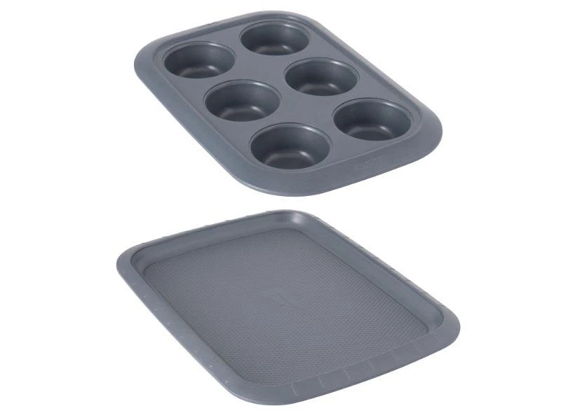 A delicious chocolate cake, banana muffins, a crusty loaf of bread or a crispy pizza. These all conjure up all kinds of tasty treats with the carbon steel Gem bakeware! These ingenious bakeware items ensure an excellent result every time, thanks to their functional features including lightweight carbon steel, a high-end non-stick coating. The icing on the cake? the grid lines are perfect for portion control! This set includes 1x small cookie sheet, 1x 6-cup cupcake pan
