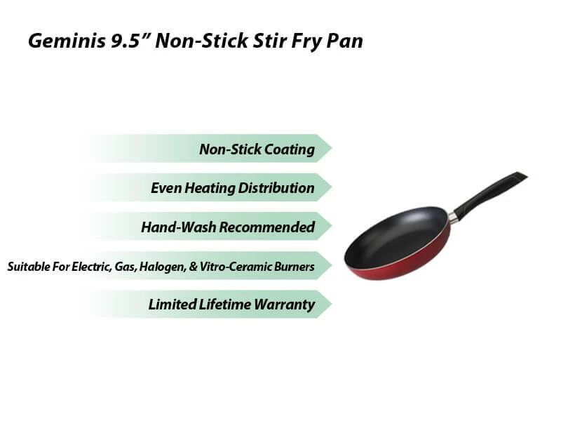 Geminis 9.5″ Red Fry Pan is has a Cast aluminum body for fast and even heat distribution, and has a non-stick coating. This Stir Fry Pan or Asian Wok is suitable for electric, gas, halogen & vitro-ceramic.