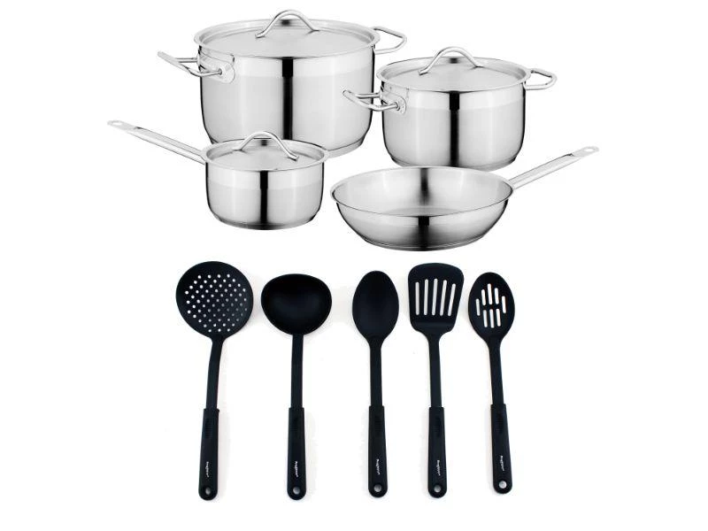 Set Includes: 1.7 Qt. saucepan, 3.9 Qt. casserole, 6.4 Qt. stockpot, 10″ fry pan, skimmer, slotted turner, slotted spoon, spoon, and ladle. The pots and pans are made from high-quality 18/10 stainless steel to withstand the test of time and are equipped with a base that provides an even heat transfer from bottom to rim for energy-efficient cooking.