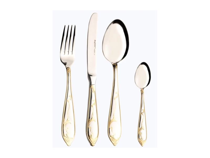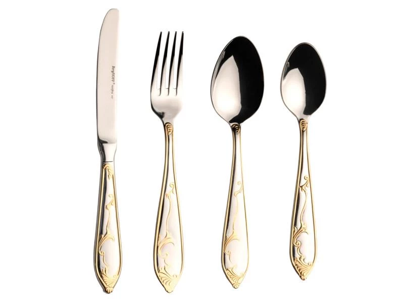 The Isabella flatware perfectly illustrates the BergHOFF philosophy of “high quality at affordable prices.” In no time your table is transformed into a very attractive setting. Creativity, perception of style and passion can be found in this choice of flatware. The highly polished surface is hard wearing, thick, easy to clean and hygienic. Gold plated on both sides. Beautiful, ornate gold detail makes this set perfect for special occasions and holidays. Set includes: 6 (8″) forks, 6 (9″) knives, 6 (8″) spoons, 6 (5″) tea/coffee spoons. –