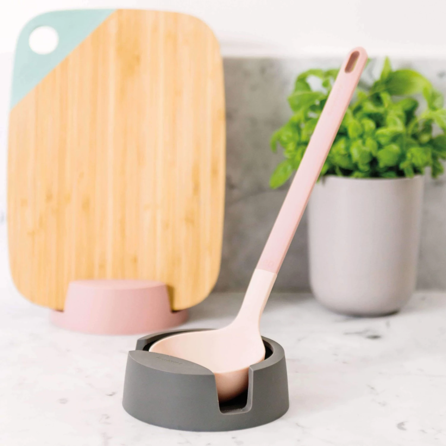 This set has been designed to be multifuctional, transforming your countertop from the moment you unpack the box. The spoon rest keeps your counters mess free, and was designed to hold more than spoons, lids and cutting board fit perfectly. Once your utensils are clean store them in the utensil crock. The crock was created with a removable cork insert that allows you to hold you knives and utensils in once space, perfect for small kitchens!