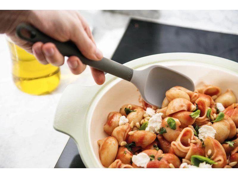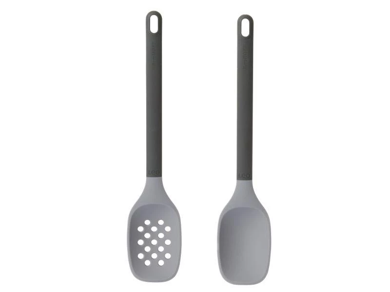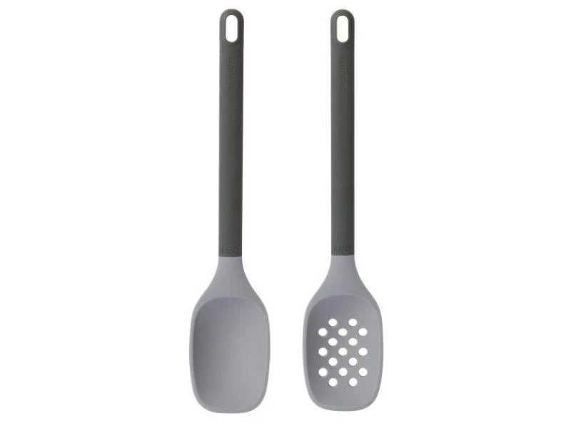 Includes: Leo Grey Serving Spoon and Skimmer. Serving spoon, Serve up mashed potatoes, rice or stews in a jiffy with the Leo serving spoon! The heat-resistant silicone spoon won’t scratch your delicate cookware while the soft-touch rubber handle ensures a comfortable grip when you’re scooping up your ingredients. When you’re done eating, just put the spoon in the dishwasher together with your pans and use the hanging loop for convenient storage. Skimmer, From pasta to peas, the Leo skimmer with silicone body is the perfect tool to skim and strain liquid from your pots and pans without scratching the delicate surface of your cookware. The soft-touch rubber handle ensures a comfortable grip and has a convenient loop so you can hang the skimmer from a hook alongside the other Leo utensils for easy access.