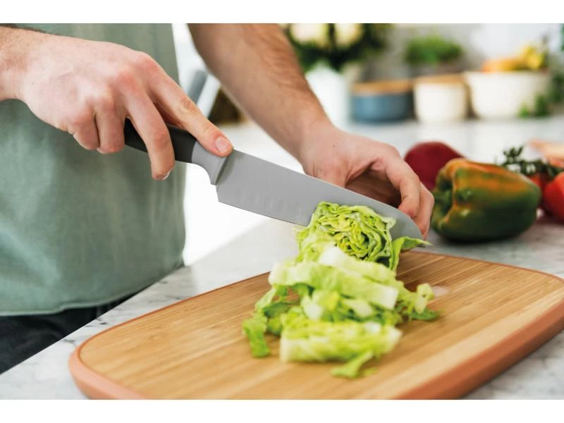 Known for its versatility, the Leo Santoku knife is the primary knife for a wide variety of cutting task. Especially cutting vegetables is a breeze thanks to the wider, lightweight blade that allows for quick chopping and has a non-stick coating which features are reinforced by the little ridges. Making a tasty julienne soup has never been easier with this all-round Asian-style knife!