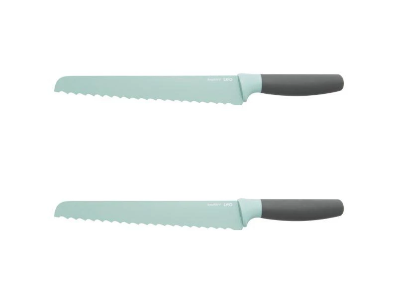 This colorful knife with non-stick coating and soft-touch handle is sure to be a real eye-catcher in any kitchen! A crusty loaf of freshly-baked bread, a sandwich bun, crispy lettuce or a shiny tomato, with its serrated stainless steel blade the bread knife powers through them all just as easily without squashing the softer inside as you slice. Like the other Leo knives, this bread knife comes with a protective sleeve that will safeguard your hands from cuts and keep the blade in good condition. Set comes with 2x 9″ bread knives