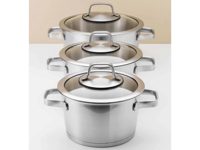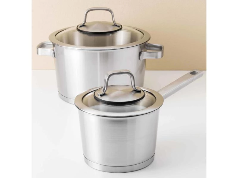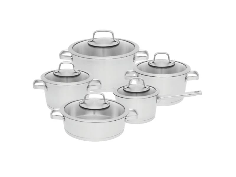 Looking for a cookware set that covers all the basics and immediately adds a touch of style to your stovetop? Then this 10 piece cookware set is just the thing for you! It consists of a covered saucepan, an 7″ and 8″ covered casserole, a covered 10″ stockpot and a covered 10″ 2-handle deep skillet, which are all suited for every kind of stovetop, induction included. All the pots and pans are made from high-quality stainless steel for extra durability and hygiene and come with a glass cover that allows you to monitor your food during cooking without losing valuable energy.