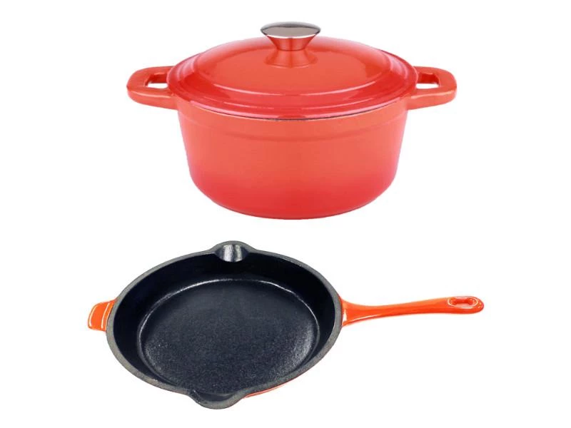Set Includes: 3qt Cast Iron Covered Stockpot, 10″ Cast Iron Fry Pan. Cast iron has great heat retaining abilities and can be used on any heat source. Classic in a modern design, solid material for all your cooking needs! Oven safe up to 400°F.