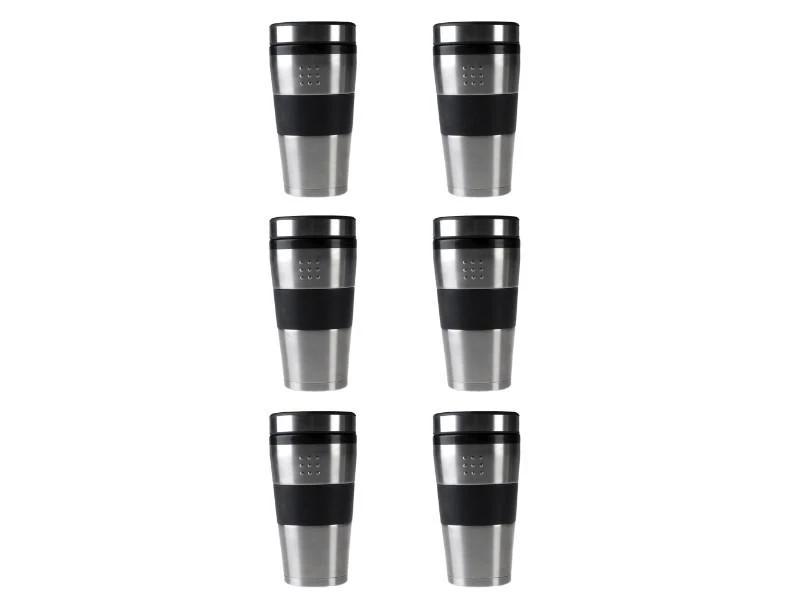 Set Includes: 6- 16oz Stainless steel travel mugs. Styled with black durable plastic for an easy stay cool grip. Double walled to keep drinks hot or cold, and an anti-skid layer for extra protection and to prevent heat damage to surfaces. Designed to fit almost all vehicle cup holders.