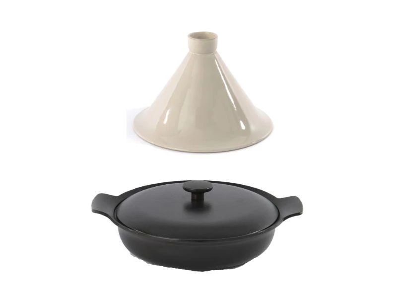 11″/3.5qt Black Covered Deep Skillet is made of Cast iron which has great heat retaining abilities: it’s the perfect choice for slow cooking and for hearty stews prepared in the oven or on the stovetop. The cover locks in the moisture and small bumps on the interior make sure the evaporated juices are directed on to the food for extra tasty results. Only little oil is needed with this pan: the perfect option for low-fat frying. Wide handles for a safe grip, even when wearing oven mitts or using potholders. 11.5″ White Tajine cover to fit the 11″ cast iron deep skillet from our Ron collection. Turn the deep skillet into a tajine, perfect for real slow cooking and all traditional dishes. Traditional cone shaped lid, allowing the steam to re-condense into water droplets which fall back onto the ingredients for tender, moist results. Elegant design for stove top and oven to table use. Oven safe