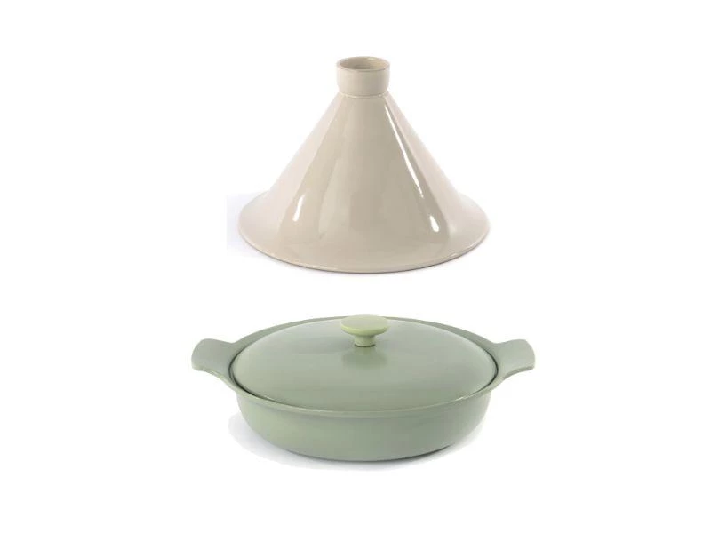 11″/3.5qt Green Covered Deep Skillet is made of Cast iron which has great heat retaining abilities: it’s the perfect choice for slow cooking and for hearty stews prepared in the oven or on the stovetop. The cover locks in the moisture and small bumps on the interior make sure the evaporated juices are directed on to the food for extra tasty results. Only little oil is needed with this pan: the perfect option for low-fat frying. Wide handles for a safe grip, even when wearing oven mitts or using potholders. 11.5″ White Tajine cover to fit the 11″ cast iron deep skillet from our Ron collection. Turn the deep skillet into a tajine, perfect for real slow cooking and all traditional dishes. Traditional cone shaped lid, allowing the steam to re-condense into water droplets which fall back onto the ingredients for tender, moist results. Elegant design for stove top and oven to table use. Oven safe