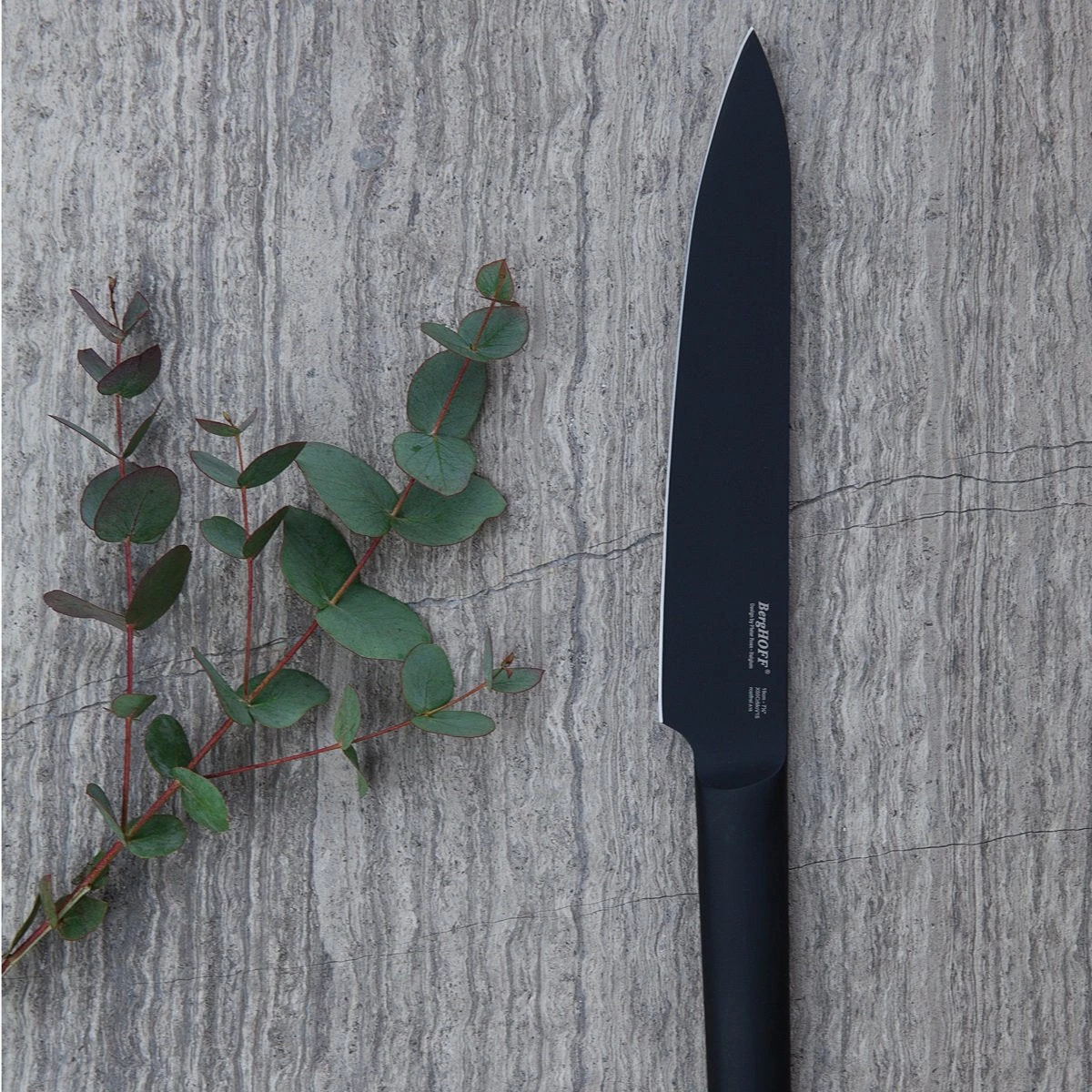 Modern in matte versatile ash wood knife block includes five black knives: chef’s, carving, santoku and paring knives. The knives’ non-stick coating allows sliced foods to slide right off, making both cutting and cleaning a breeze. This striking set of knives stands out on your countertop, looking as good as it functions. A fabulous wedding, housewarming or graduation gift.