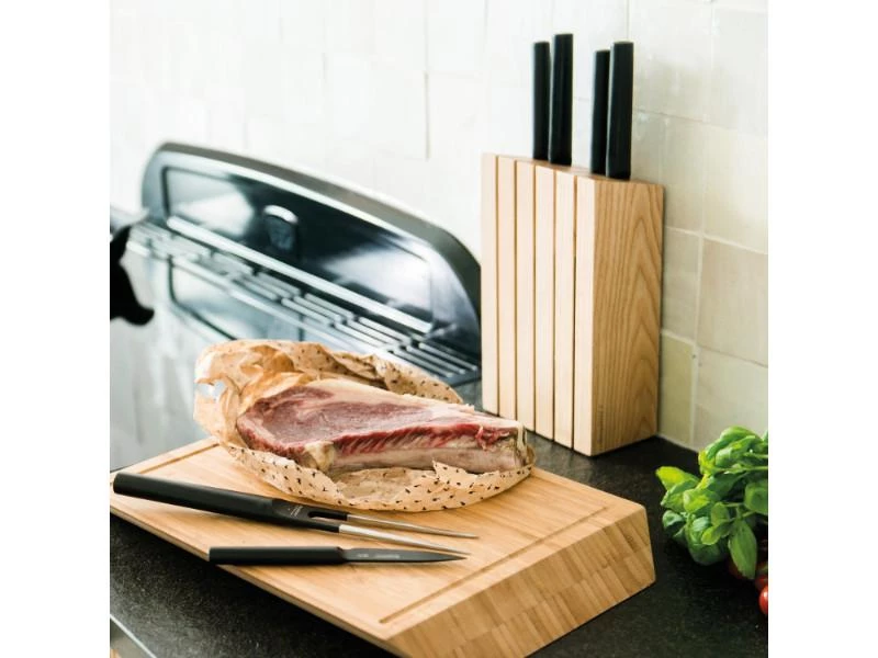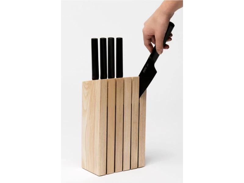 Want to give a stylish touch to your countertop? This ash wood knife block looks great in any kitchen and safely stores up to five knives. The angled design helps to protect the blades while the large, well-distanced slots ensure easy removal of each knife. The knife block comes with an anti-skid base for extra stability.