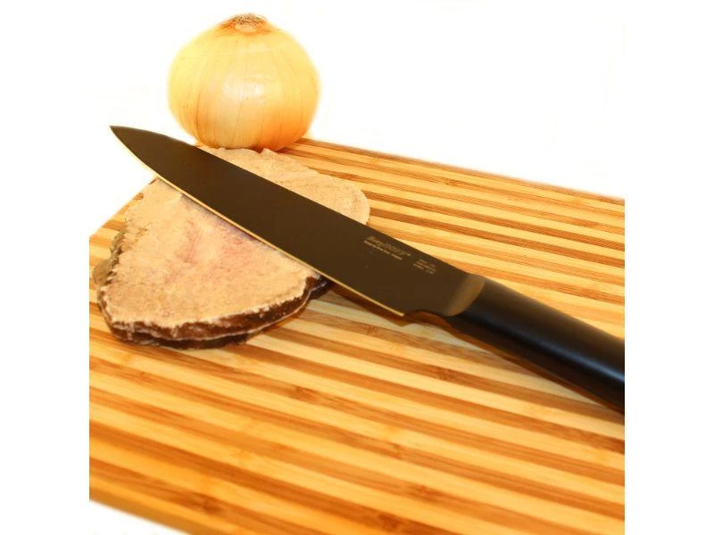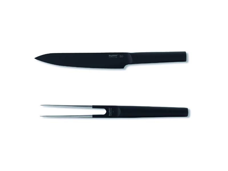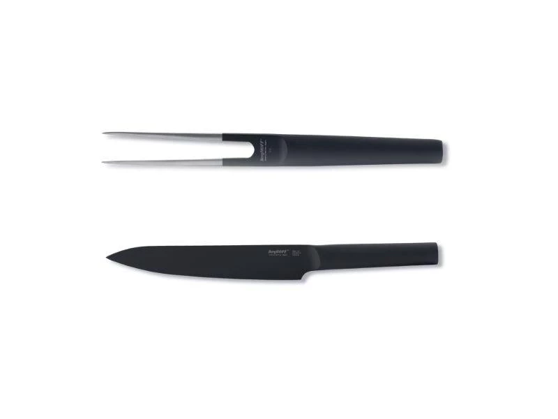 Set Includes: (1) 6.25” Santoku Knife-Black, (1) 7.5” Carving Knife-Black. The Ron line offers a range of versatile knives for the most common cutting jobs in the kitchen. The Ron Carving knife is a must have in the kitchen for roasts, hams etc. Black steel knives featuring a titanium and non-stick coating with either contrasting ash-wood handles or matching black handles.