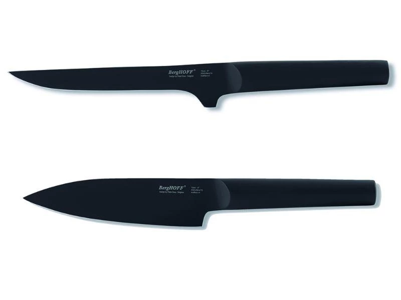 Set Includes: 5” Black Chef’s Knife. The knife’s hollow handle and heavy bolster allows for perfect balance and increases the blade’s control. Whether with contrasting ash wood handles or matching black handles, the Chef’s Knife is one of the most versatile knives in the kitchen. 6” Black Boning Knife line offers a range of versatile knives for the most common cutting jobs in the kitchen. Well balanced with a heavy bolster providing perfect balance for increased control.