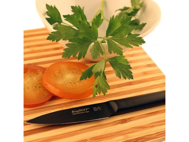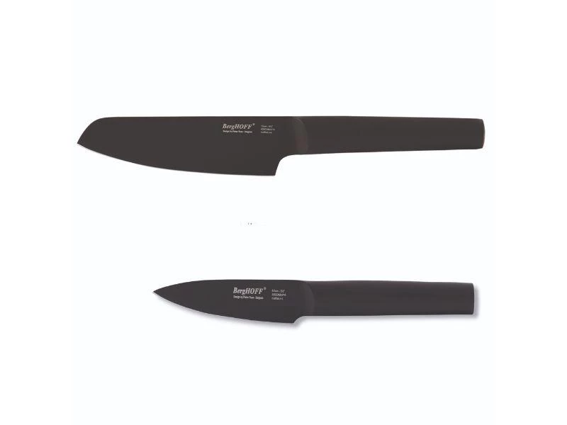 Set Includes: 4.75” Black Vegetable Knife and a 3.25” Black Paring Knife. The Vegetable knife is perfect choice for cutting fruits and vegetables. Well balanced with a heavy bolster providing perfect balance for increased control. The paring knife is perfect for skinning fruits and vegetables, and has a well-balanced with a heavy bolster providing perfect balance for increased control.