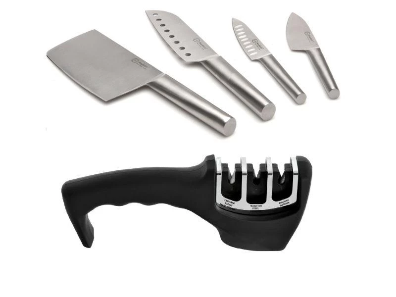 These knives are made of high quality stainless steel and feature stylish stainless steel handles. Easily sharpened and holds their edge well. The handle is safe, high impact, slip resistant as well as antimicrobial and micro-organism safe. The knife is and low temperature resistant and safe to use in the freezer. Dull knives are a thing of the past! With this handy pull-through sharpener you can sharpen your kitchen knives in 3 simple stages. The diamond surface prepares the knife for sharpening, the tungsten steel restores the cutting edge into a V-shape and the ceramic stone polishes the blade and removes any irregularities. The sharpener’s comfort-grip handle with non-slip base ensures extra stability. Set includes: (7″) Santoku knife with holes, (5″)Santoku knife grooved, (4 1/2″) Santoku knife, (7″ x 3 1/2″) cleaver, 8″ 3 in 1 sharpener.