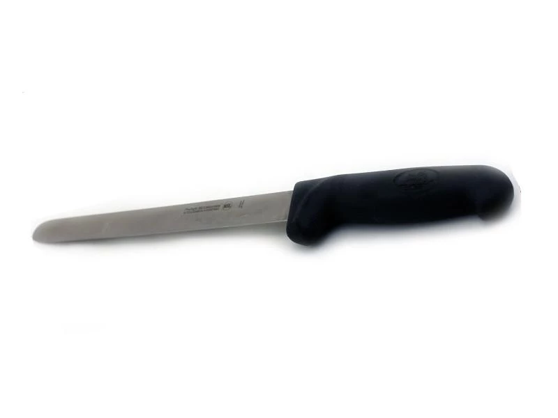 10″ Slicer is made from high quality, ice hardened stainless steel, these knives feature ergonomically designed black, soft grip, thermo plastic handles. Easily sharpened and holds their edge well. The handle is safe, high impact, slip resistant as well as antimicrobial and micro-organism safe. The knife is and low temperature resistant and safe to use in the freezer.