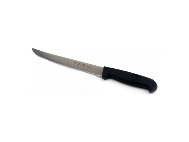 8″ Scalloped Utility Slicer is made from high quality, ice hardened stainless steel, these knives feature ergonomically designed black, soft grip, thermo plastic handles. Easily sharpened and holds their edge well. The handle is safe, high impact, slip resistant as well as antimicrobial and micro-organism safe. The knife is and low temperature resistant and safe to use in the freezer.