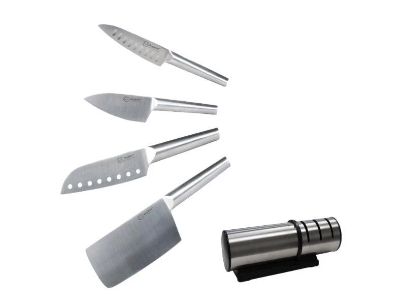 These knives are made of high quality stainless steel and feature stylish stainless steel handles. Easily sharpened and holds their edge well. The handle is safe, high impact, slip resistant as well as antimicrobial and micro-organism safe. The knife is and low temperature resistant and safe to use in the freezer. Set includes: (7″) Santoku knife with holes, (5″)Santoku knife grooved, (4 1/2″) Santoku knife, (7″ x 3 1/2″) cleaver. This set also includes a 19″ Stainless steel sharpening steel for your knife set. Always use a high quality steel by BergHOFF for your top quality knives. These sharpening devices are exactly made to match the steel of the blades and guarantee an optimum result. Be sure to maintain a 20° angle from tip to handle over the complete length of the blade. The speed of the process has no impact on the result.