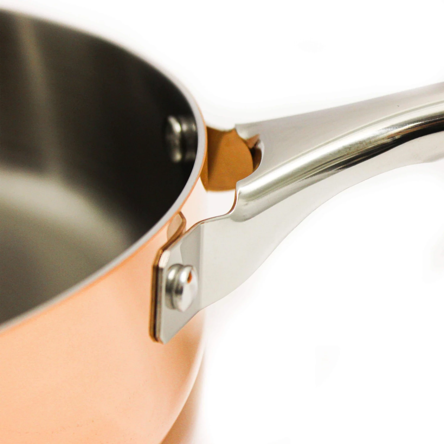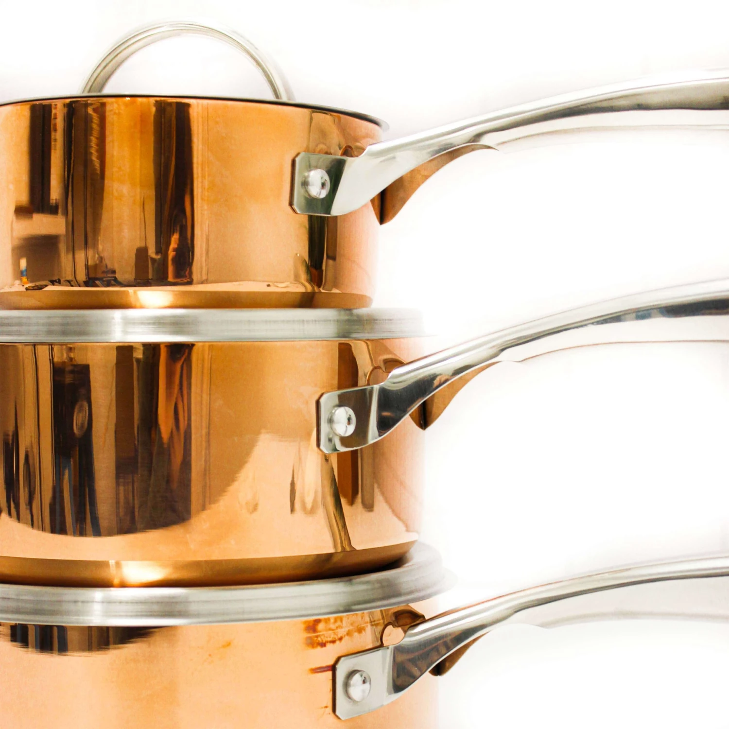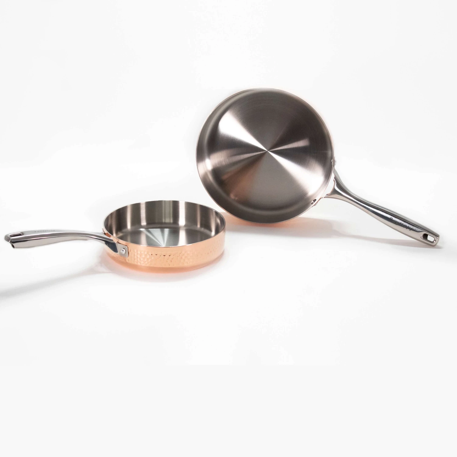 This beautiful polished copper cookware set is sure to be the focal point of your kitchen. With its stunning hammered design you will be glad to show this set off to all your friends and family. Set includes: 1 Qt sauce pan with lid, 2 Qt sauce pan with lid, 3 Qt sauce pan with lid, 5.75 Qt Dutch oven with lid, 8″ deep skillet/fry pan and 9.5″ deep skillet/ fry pan.