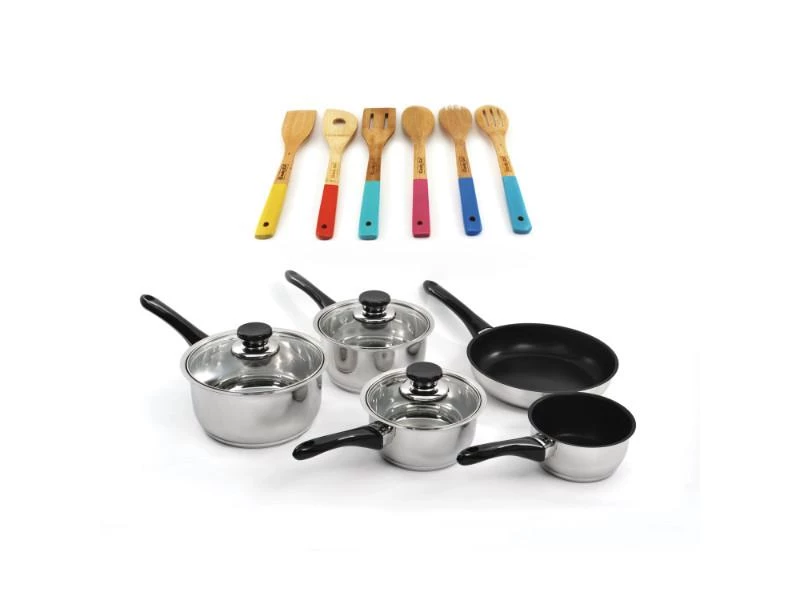 Set Includes: 6.25″ covered sauce pan, 7″ covered sauce pan, 8″ covered sauce pan, 5.5″ milk warmer, and 10″ fry pan. 6 Pieces Bamboo utensils Multi colored. Glass lids for easy monitoring without the need to lift the lid, which helps to save energy and keep valuable nutrients inside the pan. Revolutionary multi-layer base for fast and energy-saving cooking. Even heat distribution throughout complete surface of the base. No hotspots or burning food. Fry pan and milk boiler have a multi-layer PFOA-free non-stick coating for easy food release and healthy cooking (use as little oil as you’d like). Large stay-cool handles for easy grip and control. The utensils set is made of bamboo which is seeing a resurgence in popularity as it is considered a “Å“green product.” Cleaning bamboo is easy, just wash with soap and water. The natural beauty and durability is unique. Set includes two bamboo spatulas and four oversized spoons with multicolored handles. Dishwasher safe.