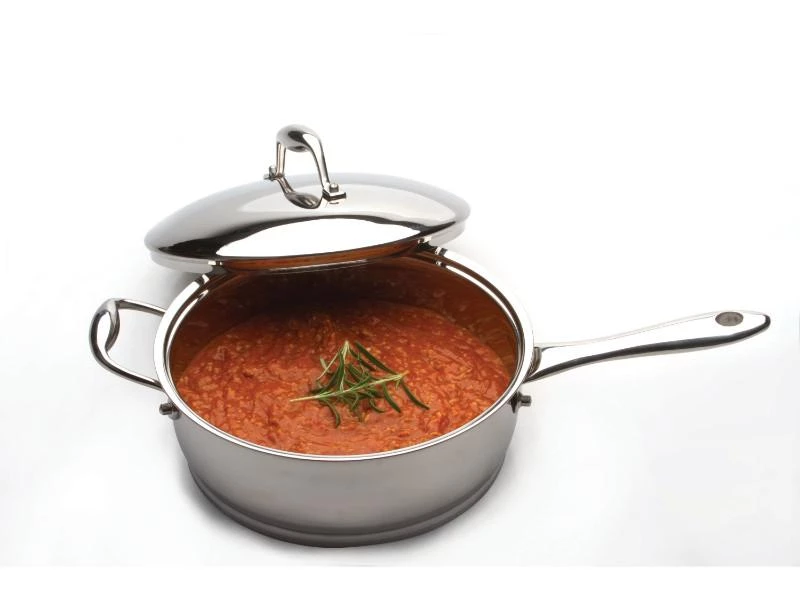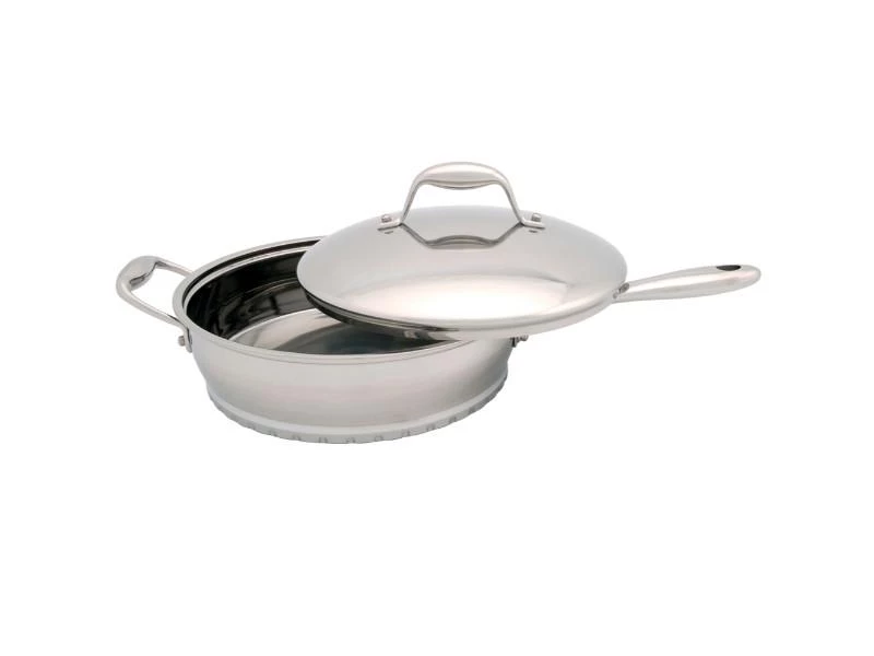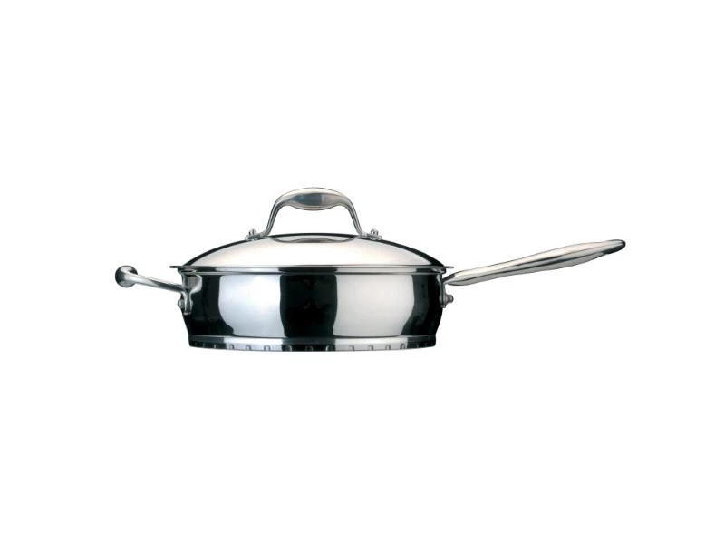 10″/2.6qt Covered Sauté Pan has a round belly, mirrored outside finish and 18/10 stainless steel are the distinguishing features of this line. Revolutionary 6-layer sandwich base for fast and energy-saving cooking. The 18/10 stainless steel lid seals the pot, preventing moisture and juices from escaping. The ergonomic shaped handle offers a safe grip and comfortable lifting.