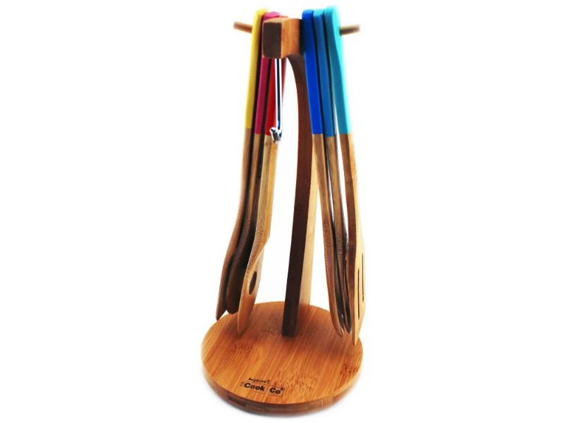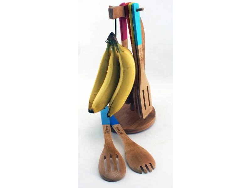 This bamboo stand is multi functional. You can hang your produce on display front and center that encourages bananas to ripen evenly. In addition to its prominent banana hook, the hanger accommodates two spatulas and four oversized spoons, all made of eco-friendly bamboo and designed to hang easily on the stand’s two pegs.