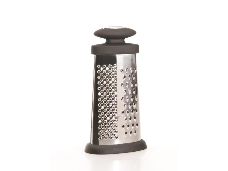 Constructed of stainless steel and equipped with a top handle and anti-skid base. Multi-use grater features 4 unique functions: Large-Hole Shredder for coarse shreds of vegetables or cheese Slicer creates long, thin slices great for making potato chips Small-Hole Shredder use for a fine shred, works on vegetables or cheese Grater creates small nuggets, perfect for hard cheeses like Parmesan