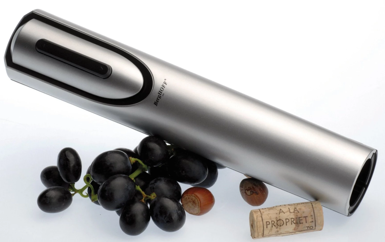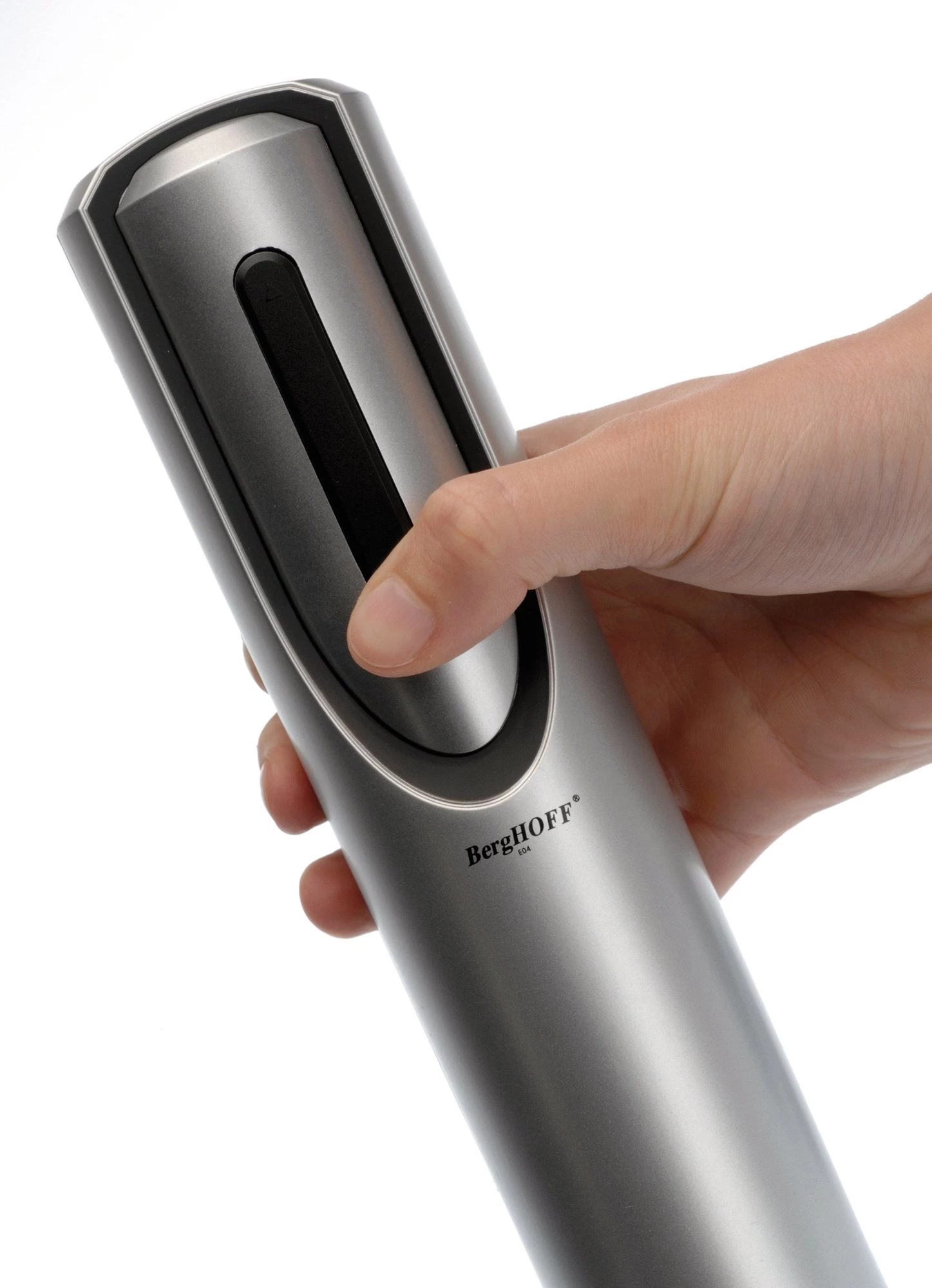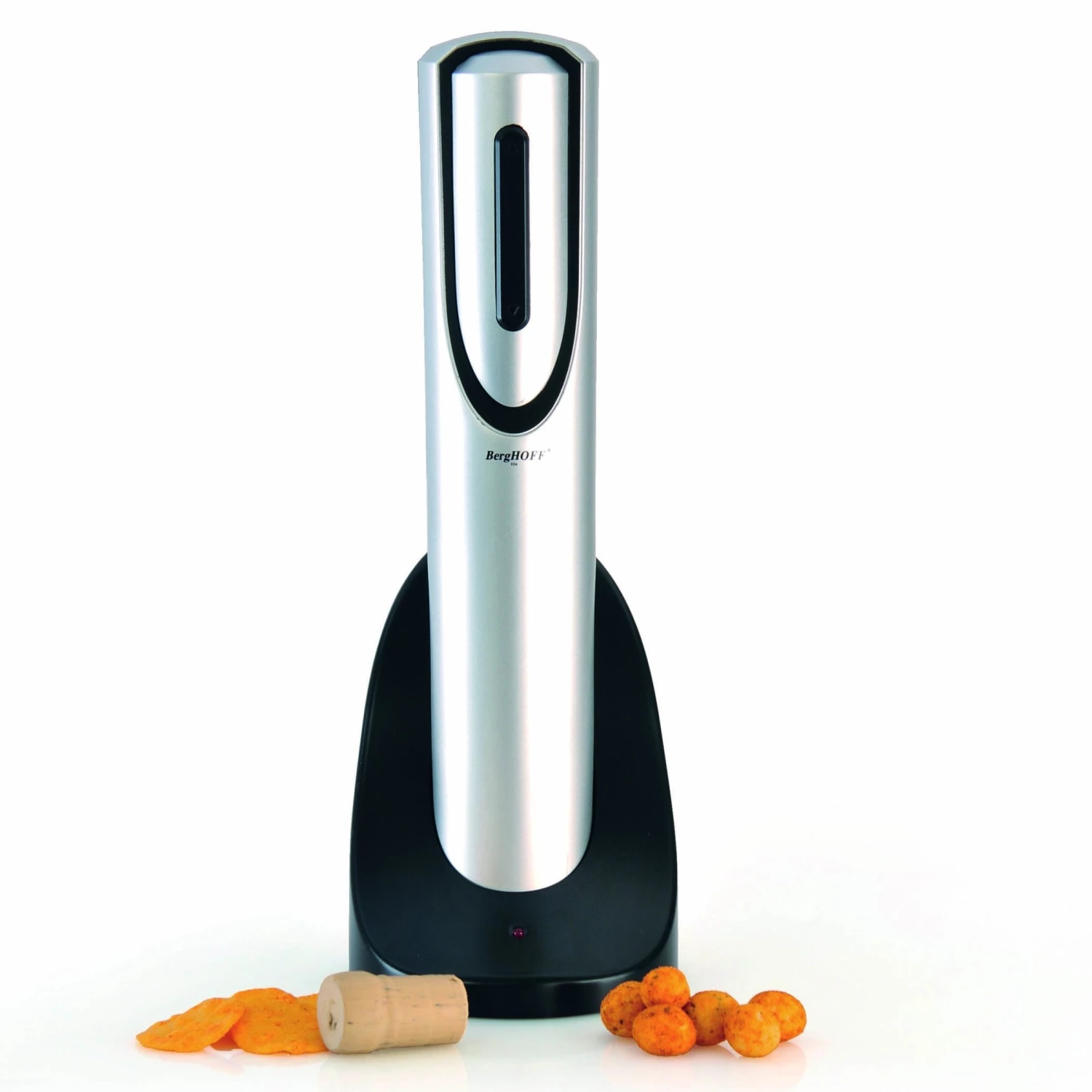 With BergHOFF’s Geminis Electric Wine Opener, uncorking wine has never been easier. Our modern design allows you to simply place the corkscrew over the neck of any wine bottle, press the elongated button and effortlessly remove the cork in seconds with no manual twisting or pulling required. Ideal for entertaining large groups where multiple bottles are required. Dual corkscrew direction options provide ease of use even when removing the cork from the corkscrew. Clean, contemporary lines, brushed stainless steel look with matte black soft grip accents make this beautiful essential tool a must-have for any kitchen or in-home bar. Works with all types of corks including synthetic. Includes an attractive stable base for storage and ease of recharging. Convenient foil cutter has a smart hideaway spot included on the base so it’s available when and where you need it most. Easy to use. Set includes 1-wine opener, 1-charging base, 1-foil cutter, 1-power supply. Standard U.S. outlet 120V; 6′ power cord.