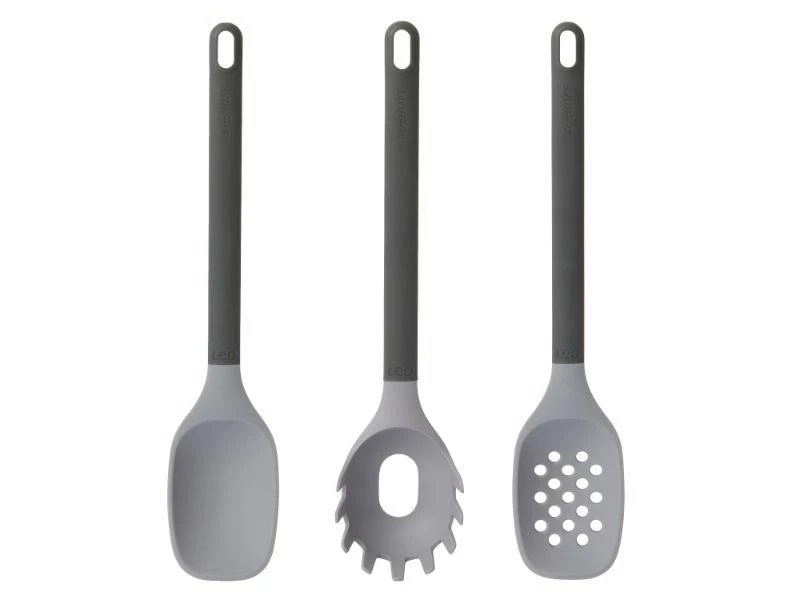 Serving spoon, Serve up mashed potatoes, rice or stews in a jiffy with the Leo serving spoon! The heat-resistant silicone spoon won’t scratch your delicate cookware while the soft-touch rubber handle ensures a comfortable grip when you’re scooping up your ingredients. When you’re done eating, just put the spoon in the dishwasher together with your pans and use the hanging loop for convenient storage. A traditional spaghetti bolognese, a creamy spinach tagliatelle or a delicious prawn linguine, it all starts with the right tool to handle your pasta. The Leo pasta spoon helps you to measure a good serving size of pasta and easily lifts out the cooked noodles without scratching your pan’s delicate non-stick coating. Skimmer, From pasta to peas, the Leo skimmer with silicone body is the perfect tool to skim and strain liquid from your pots and pans without scratching the delicate surface of your cookware. The soft-touch rubber handle ensures a comfortable grip and has a convenient loop so you can hang the skimmer from a hook alongside the other Leo utensils for easy access. Order comes with 12.75″ serving spoon, 12.25″ pasta spoon, 12.75″ skimmer