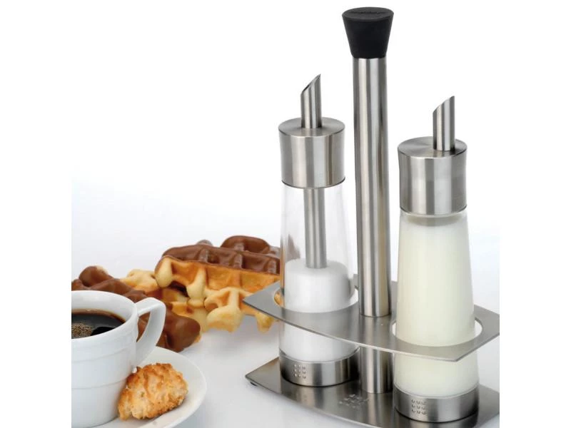 Serve your cream and sugar in style with this high quality stainless steel 3 Pieces set. Keep the set out for your guests to admire or store it when not in use. Set includes: (7 1/4″ x 2″) sugar dispenser, (7 1/4″ x 2″) creamer and (9″ x 6″) stand. Rubber accents & easy to clean.